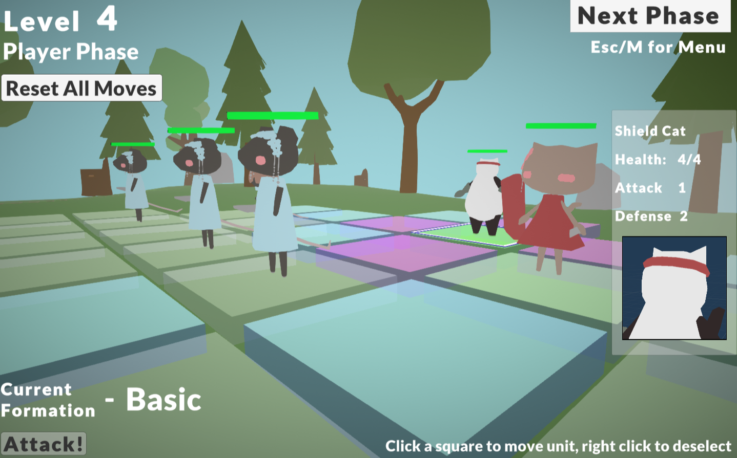Over the summer, my friends and I participated in the GMTK game jam and made a 3D strategy RPG in Unity called Feline Formations! I focused mainly on programming and design, implementing the following systems: